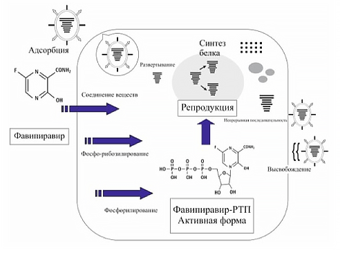 Фавипиравир-RTP ингибирует вирусную репликацию взаимодействуя с вирусной РНК-полимеразой, что приводит к снижению вирусной репликации.